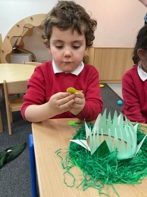 On the run up to Easter, we have been getting crafty. We put so much effort in to our Spring bonnets for the Spring bonnet competition. We loved wearing them and showing them off in class. We have also made some Easter chick egg holders to take home and share with our families!