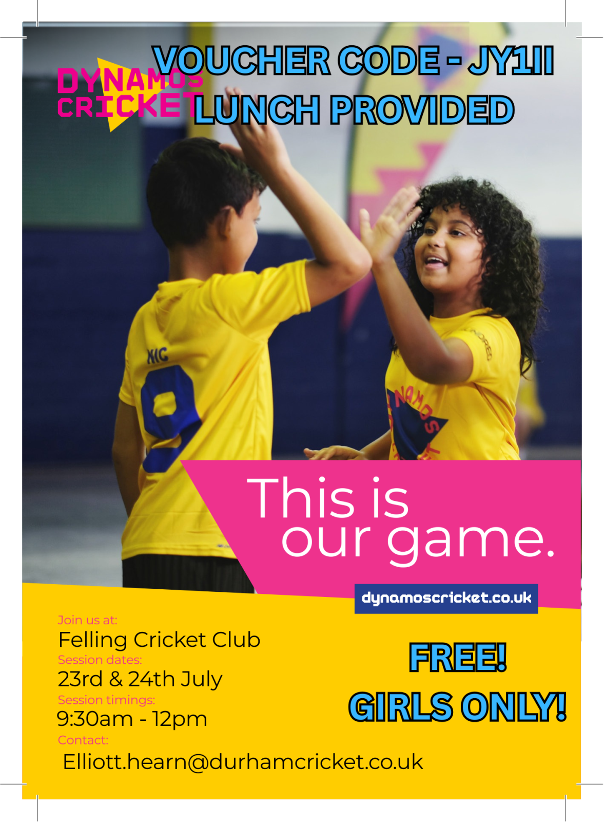 The Summer camp will be held at Felling Cricket Club, on the 23rd and 24th July 2025 and is FREE of charge when using the voucher code listed on the attached flyer, saving parents/guardians £50.00!